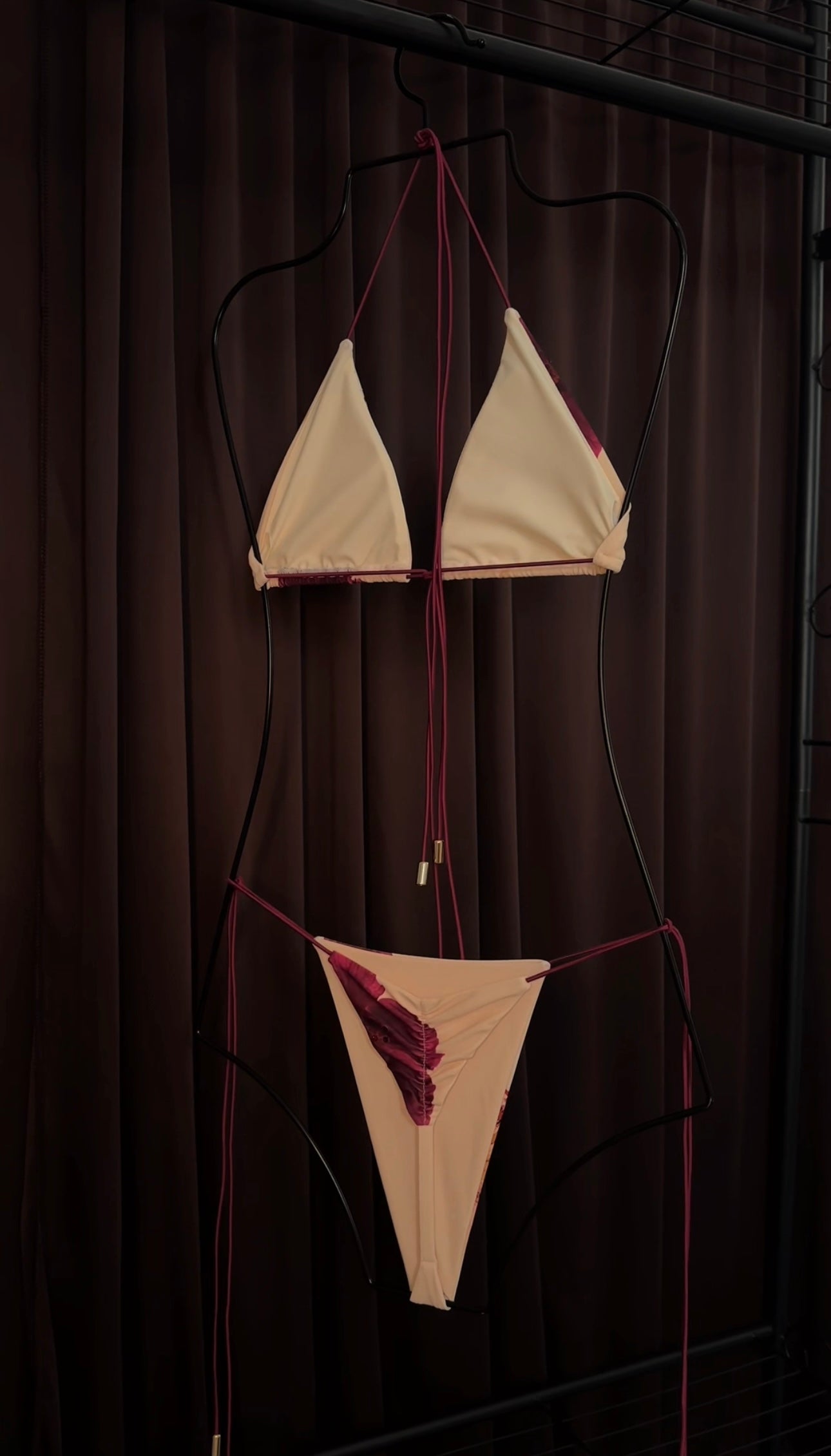 This set comes with our signature triangle top with removable padding and our classic ruched triangle thong featuring adjustable tie sides and golden hardware. Cut to accentuate your natural curves, it flatters every shape while offering lasting comfort.